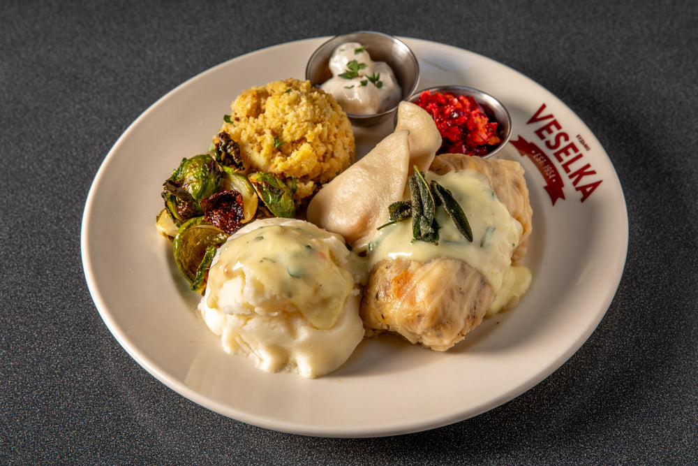 - 1 vegetarian stuffed cabbage with rice, sauerkraut and mushroom filling with gravy